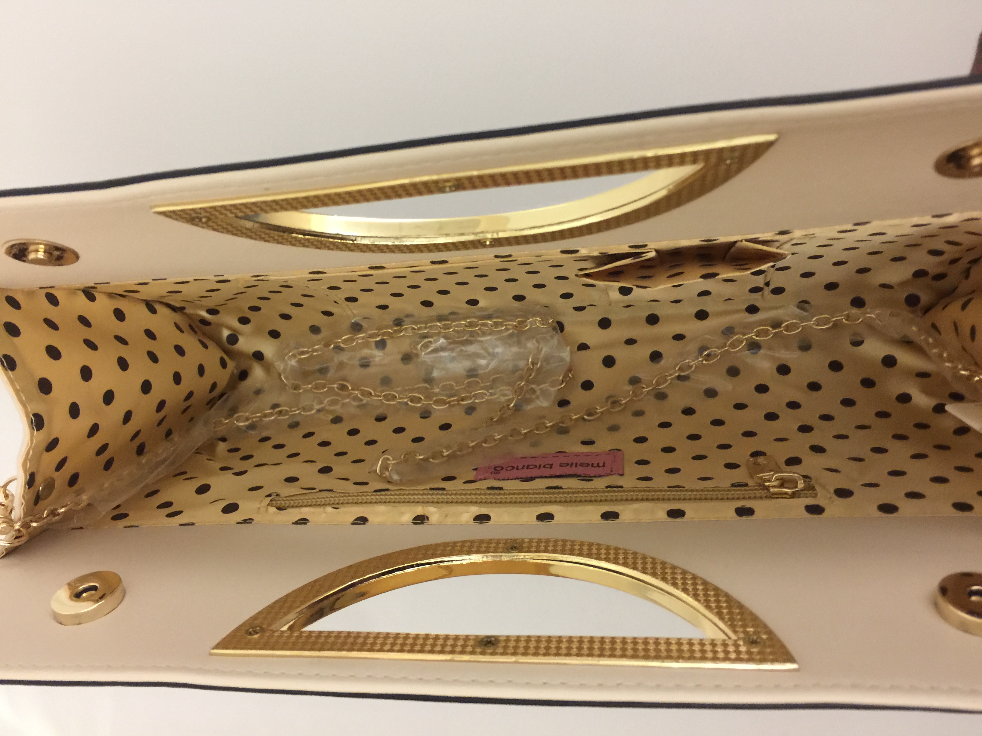 Molly is ready for whatever you bring her way. Can be worn as top handle clutch or detachable gold chain strap to wear crossbody 13"L, 8"H Comes with dust bag